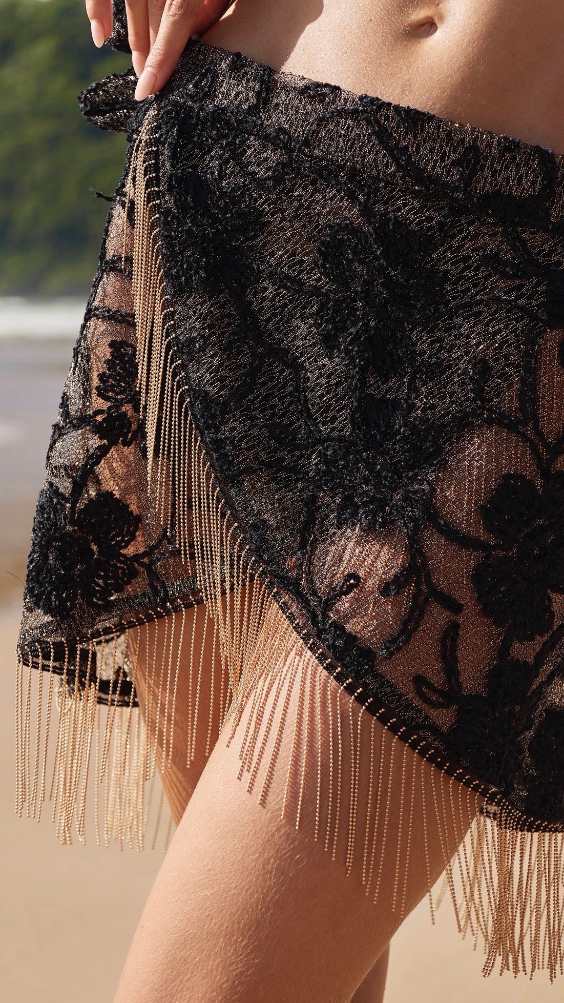 O grande destaque da peça está na franja de metal dourado, que adiciona movimento, luxo e um efeito joia a cada passo, elevando a saia a um nível de exclusividade raro na moda praia. O contraste entre a leveza da tela e a força do metal cria uma estética poderosa, sensual e chic na medida certa.