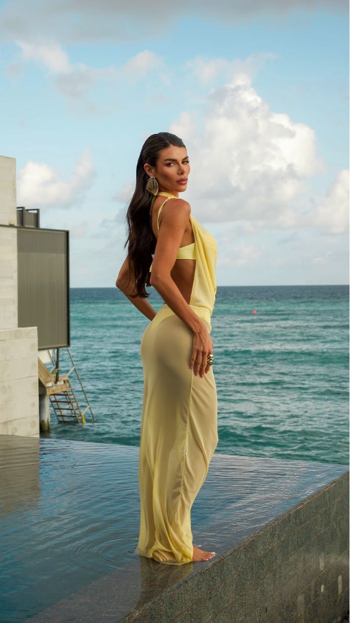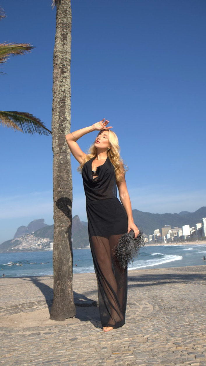 Com amarração no pescoço e elástico na cintura, se ajusta facilmente ao corpo, valorizando a silhueta com leveza. Acompanha uma mini saída que também pode ser usada por baixo do vestido, oferecendo versatilidade para transitar da praia ou piscina a momentos mais descontraídos.