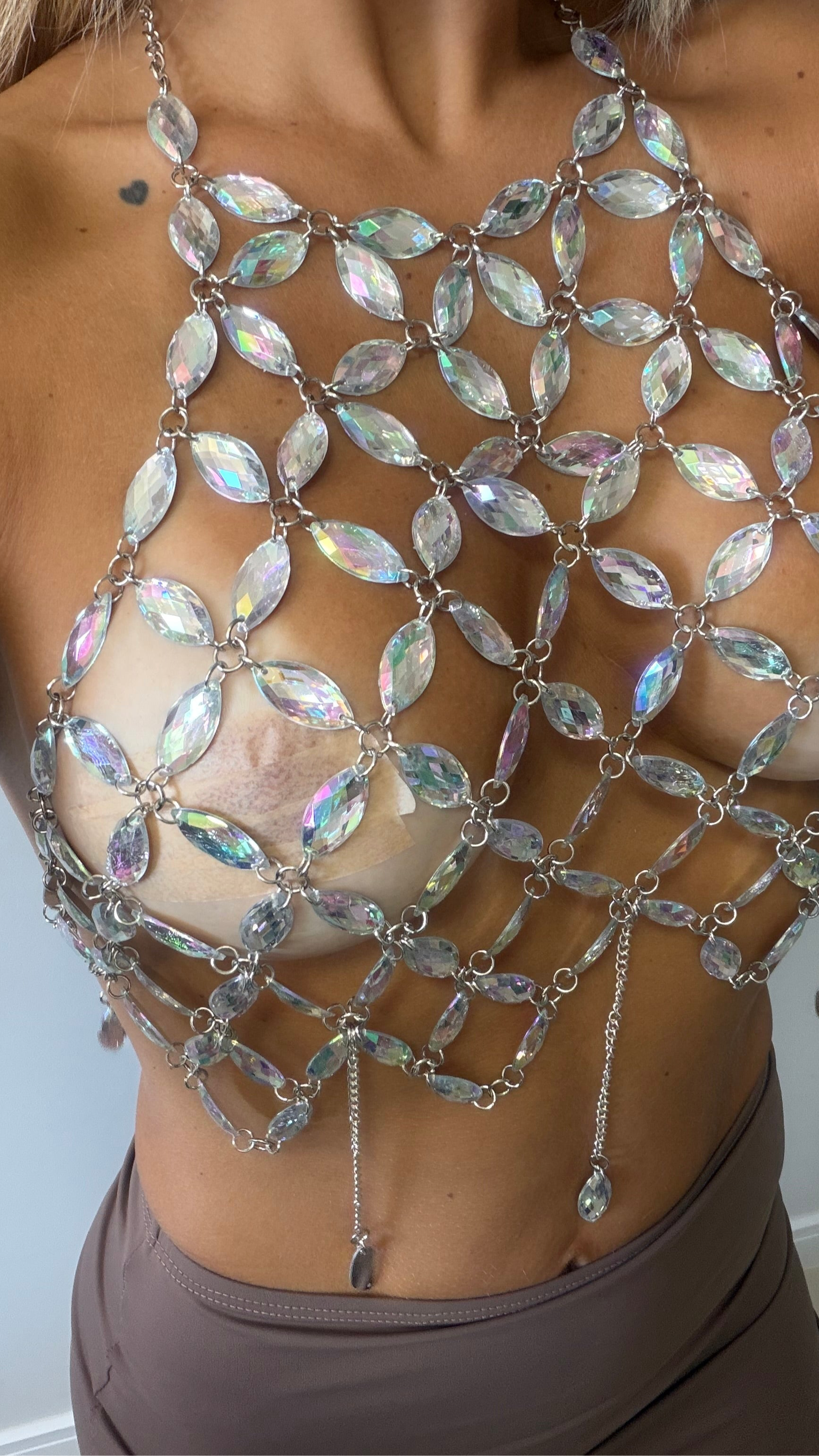 Confeccionado em strass prateado de alto brilho, o modelo frente única destaca o colo de forma elegante e sensual, criando um visual poderoso e extremamente luminoso — ideal para festas, blocos exclusivos, camarotes e produções noturnas.